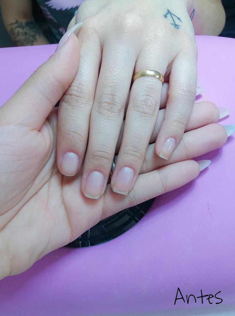 O processo exige bastante cuidado para sair tudo perfeito. Primeiro, a manicite lixou as unhas naturais, com todo o cuidado para conservá-las.