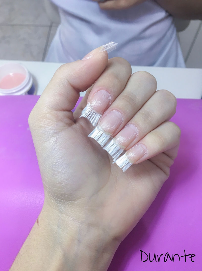 Depois, ela colocou a fibra de vidro. A manicure passou uma camada de gel para moldar a unha e foi modelando o formato para que ficasse o mais natural e semelhante com meu formato natural de unha.